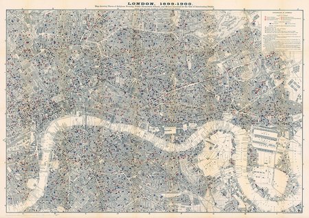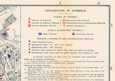 London 1899-1900 Historic Map Showing Places of Worship, Schools, Beer houses, Restaurants, Grocers